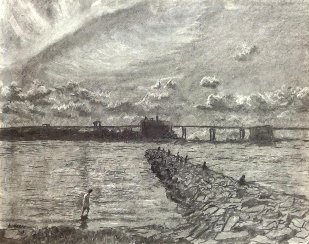 ‘Fishing near Throgs Neck Bridge, Queens NY’, charcoal (18 x 24″)