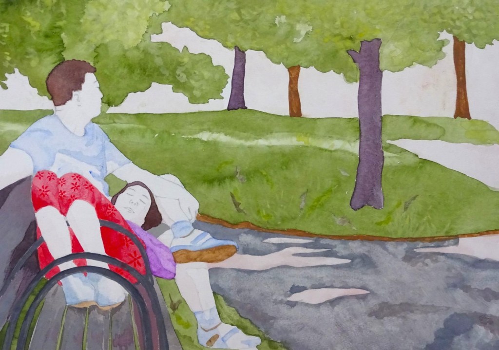 ‘Couple On A Park Bench, Queens NY’ – gouache painting, 16 x 22″