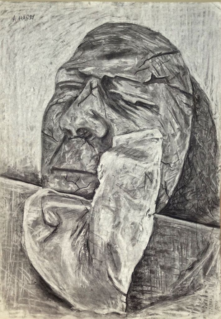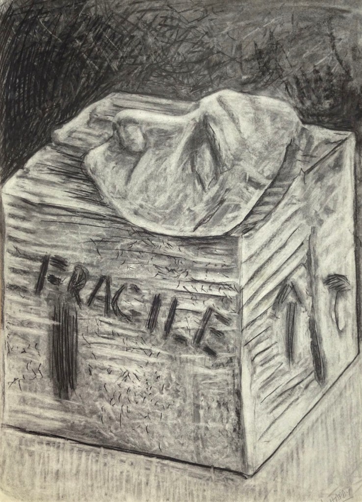 ‘Clay Mask still life and box #1’ – large art class drawing in charcoal